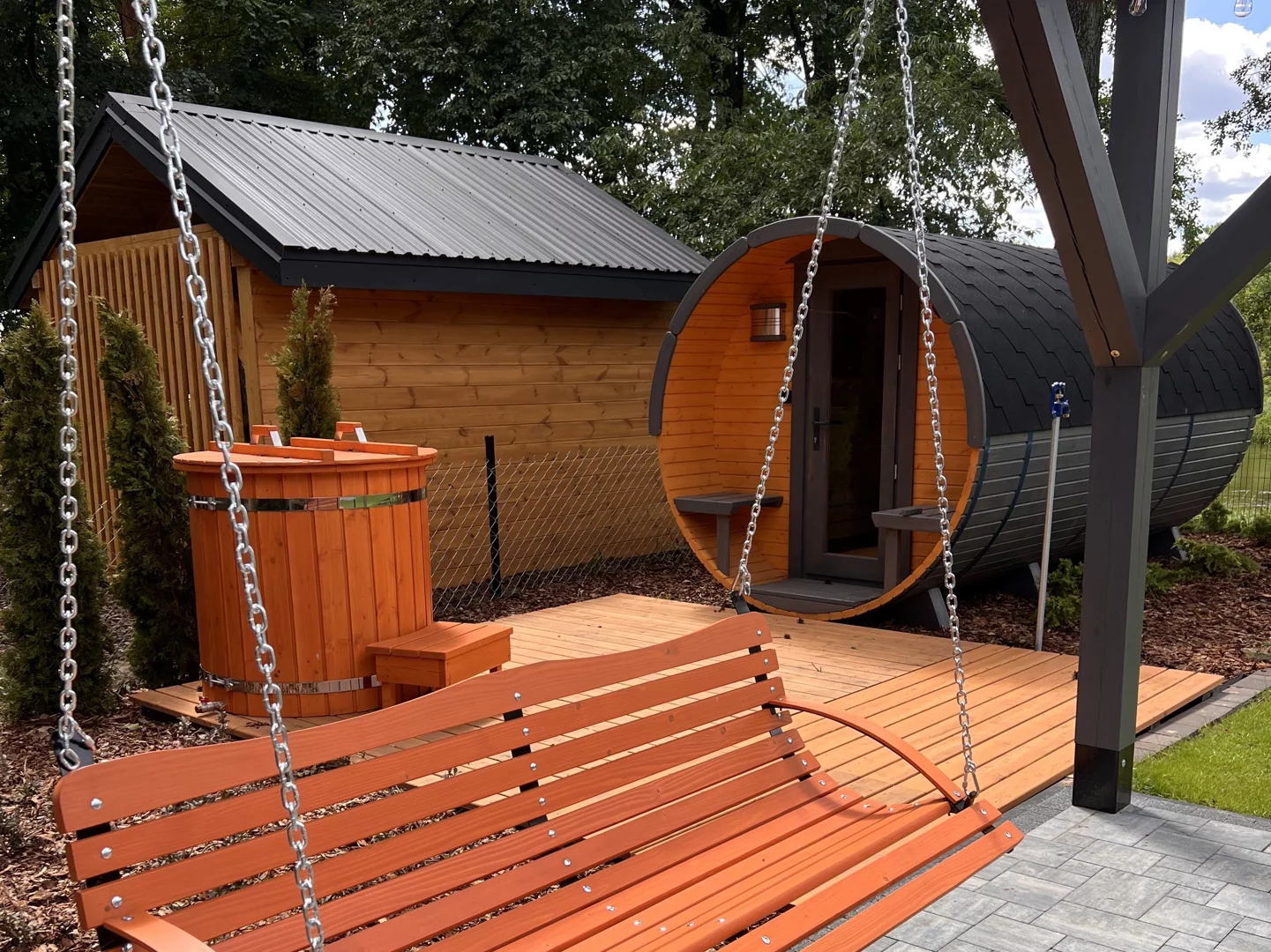 - Sauny na terenie działki: Przy domkach postawiliśmy dla Was również sauny (dodatkowo płatne), w których możecie odpocząć, wyciszyć się i naładować baterie.